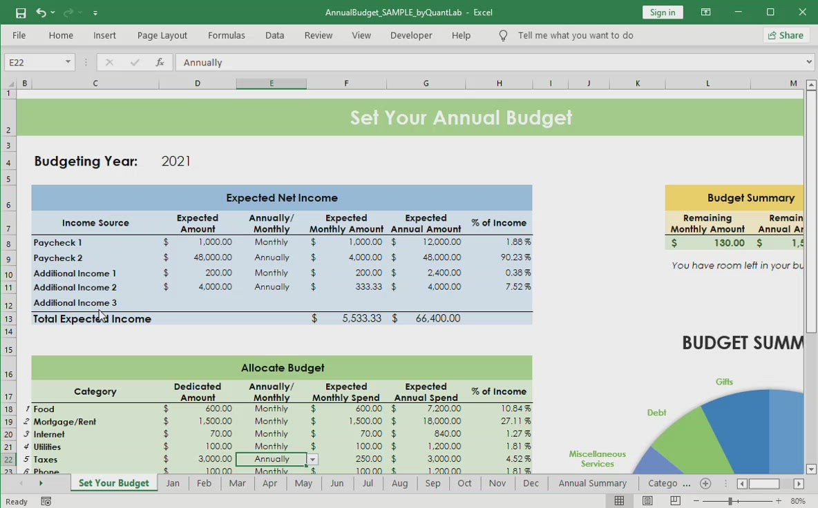 • Allocate how your budget should be distributed among different spending categories (once more, there is flexibility to specify each expense as annual or monthly)