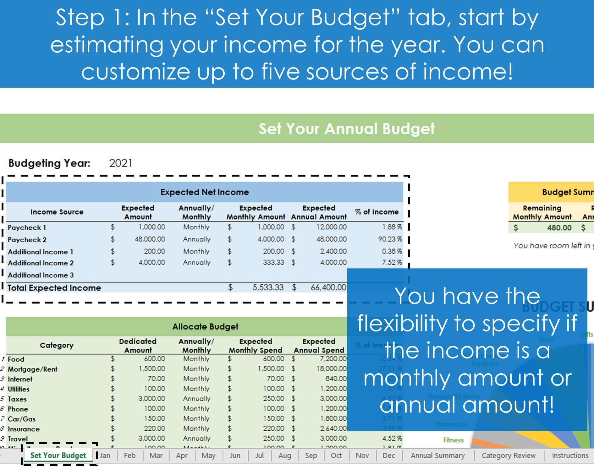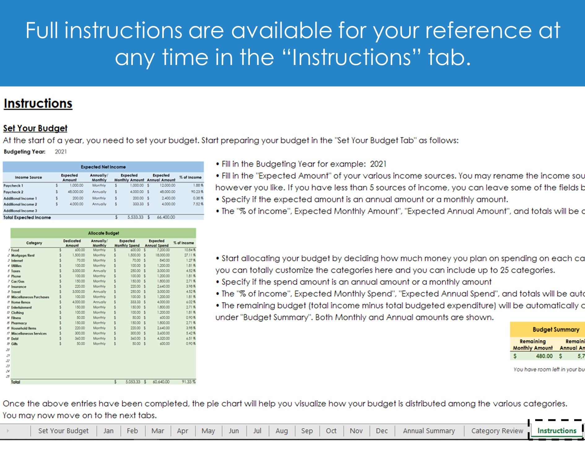 Look no further, this is the perfect all-in-one tool to help you set a budget for the year and stick to it! Budgeting is the best way to manage your personal finances, as it will help you understand where you are spending your money, how your expenses balance with your income, and how you can make lifestyle changes and re-prioritize your expenses. Setting a budget is essential for families and households, young professionals, as well as college students, and this tool will make it easy to get started. This budgeting template is very simple to use: