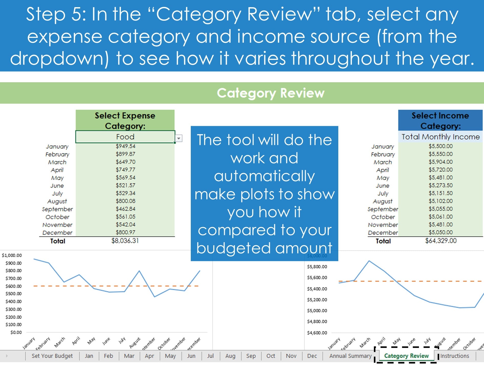 • The "Category Review" tab will let you select any individual spending category and/or income source to see how it varies throughout the year. The tool will automatically create a graph to show you how the amount changes over the months and how it compares to your budget.