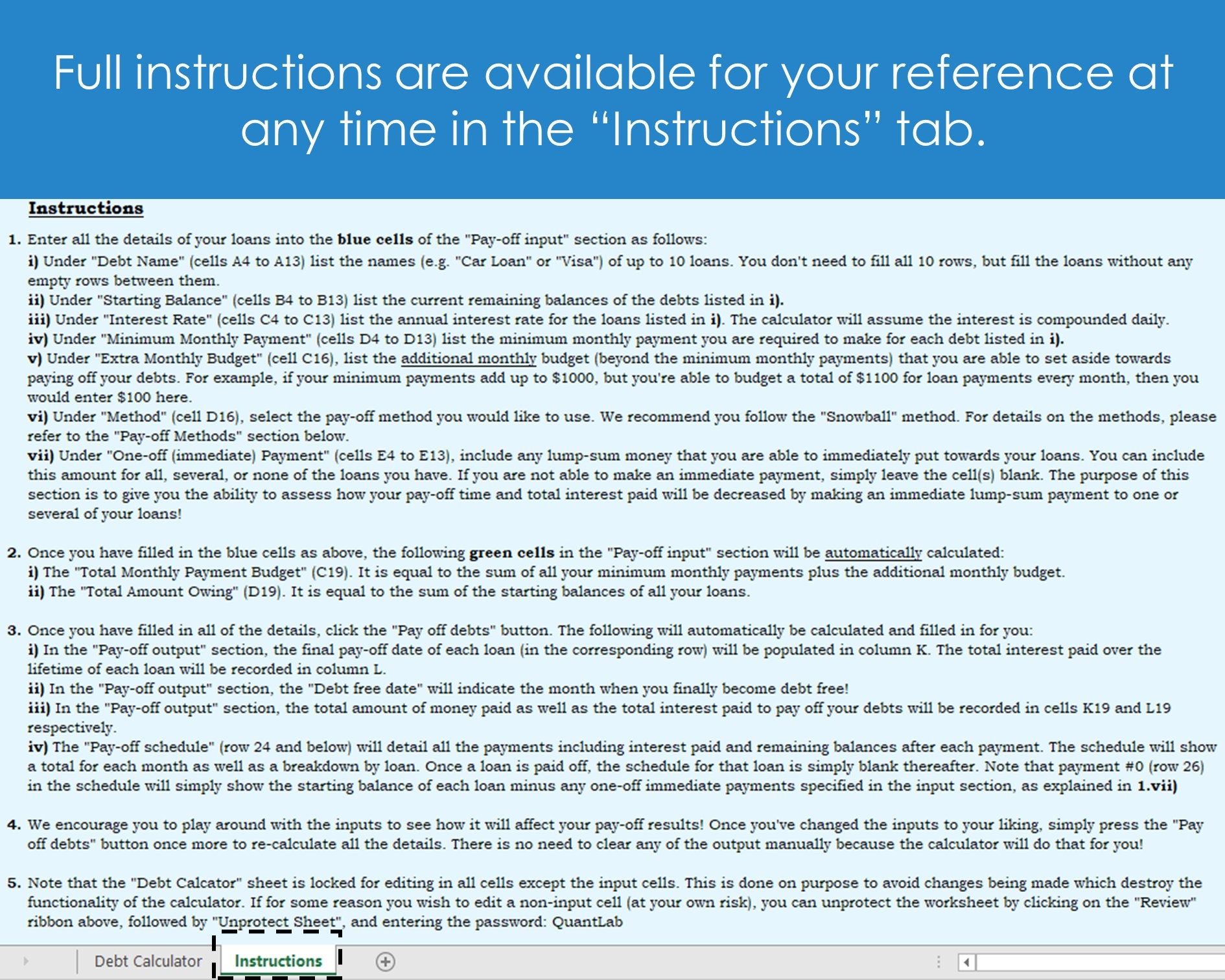Do not copy or distribute the products of QuantLab Spreadsheets either for free or commercially. This is for your personal use only.