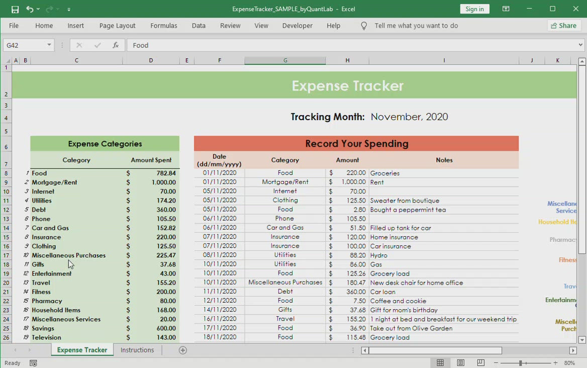 This spreadsheet will reveal exactly how your money is being spent! Somehow expenses just add up and it can be hard at times to understand where the money goes. This tool solves that problem by categorizing all your expenditures and showing you exactly how your spending is distributed. Understanding your expenses is crucial when trying to trim your budget. This spreadsheet is perfect for families and households, college students, young professionals, and retirees! This expense tracker is very simple to use: