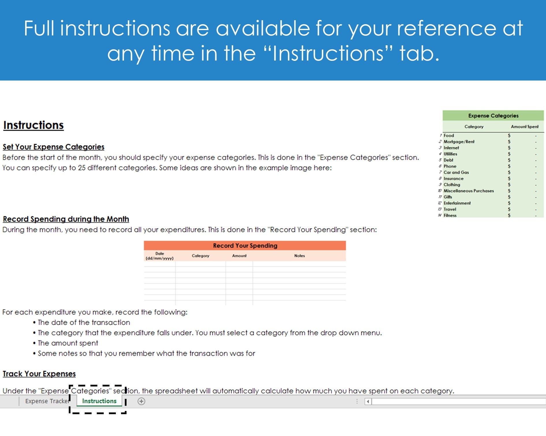 - Throughout the month, record your daily expenses and label them under one of the spending categories
