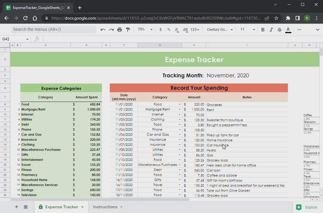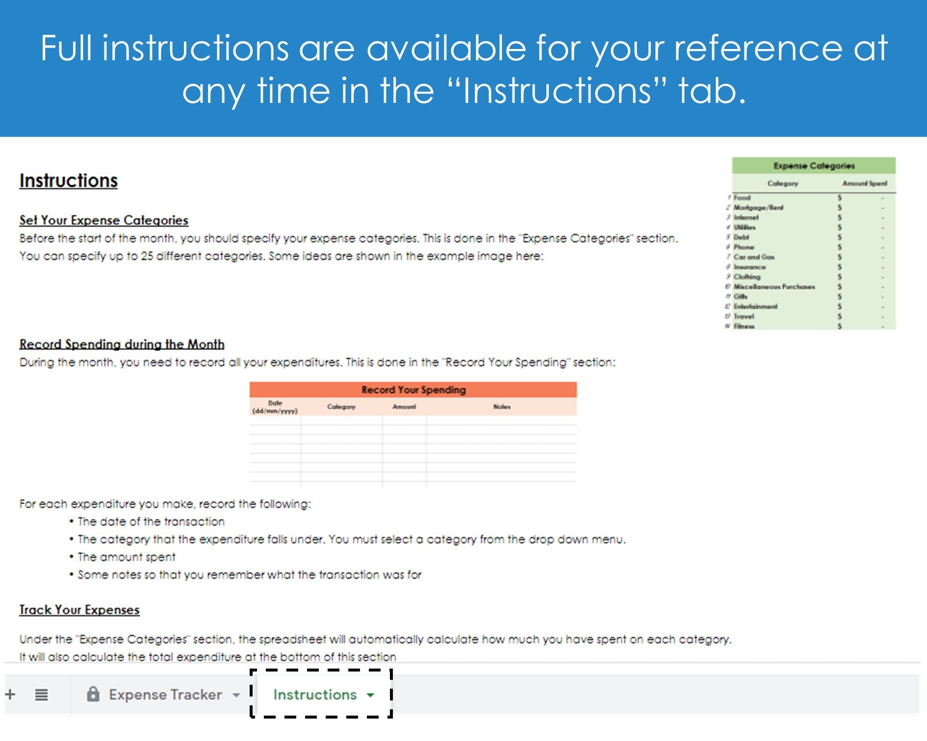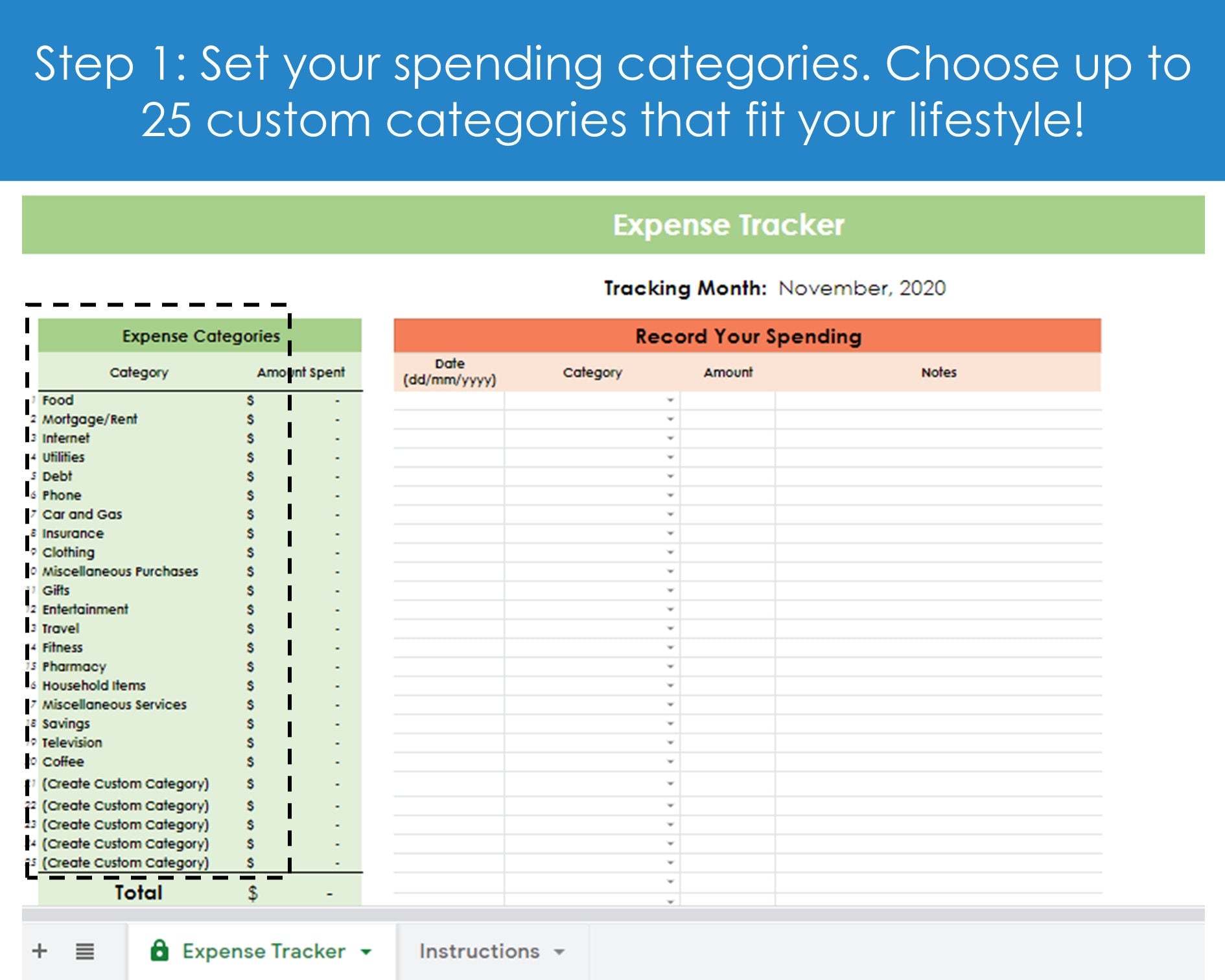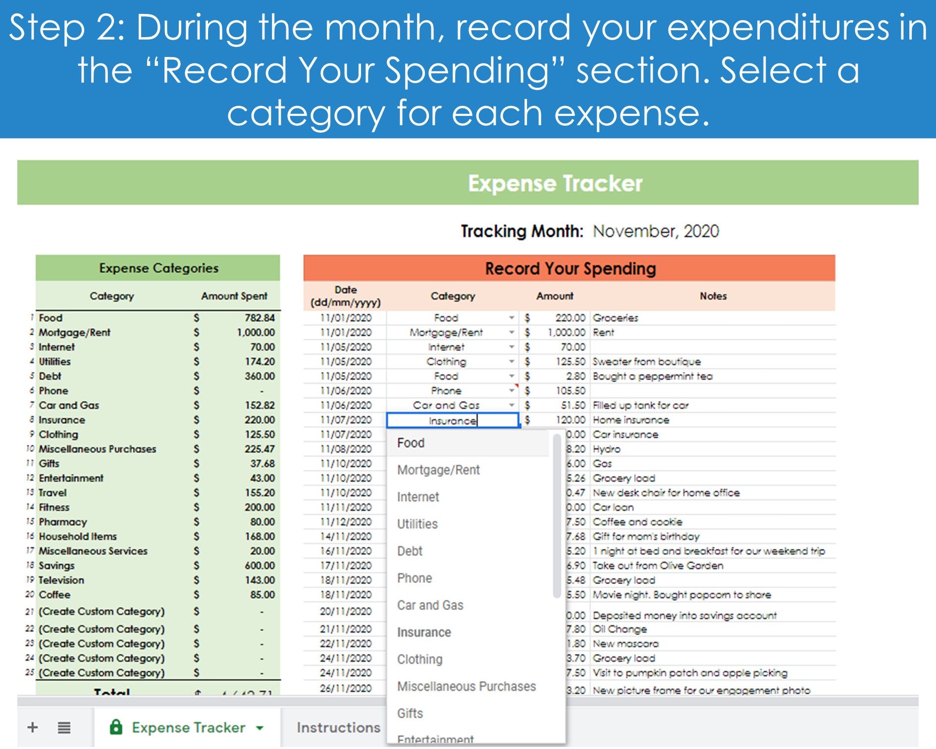 - Throughout the month, record your daily expenses and label them under one of the spending categories