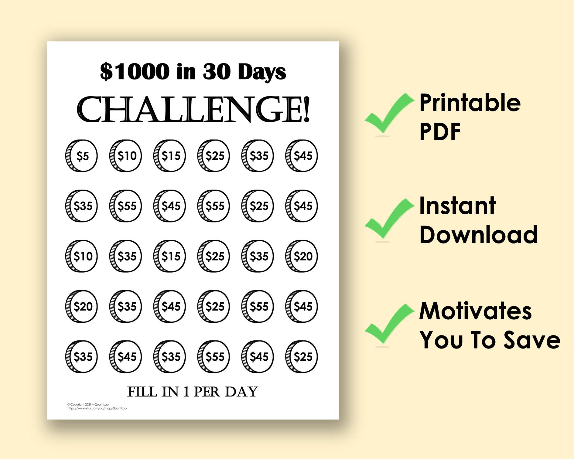 This is the best motivational tool to reach a $1000 savings goal over the course of 1 month! Every day you set aside a small amount of money, as indicated on the sheet, and then color/shade in a coin corresponding to the amount. This printable PDF will keep you accountable and get you excited about saving. By setting aside a little money (as little as $5!!) every day, you won't believe how easy it can be to save $1000 over just 30 days.