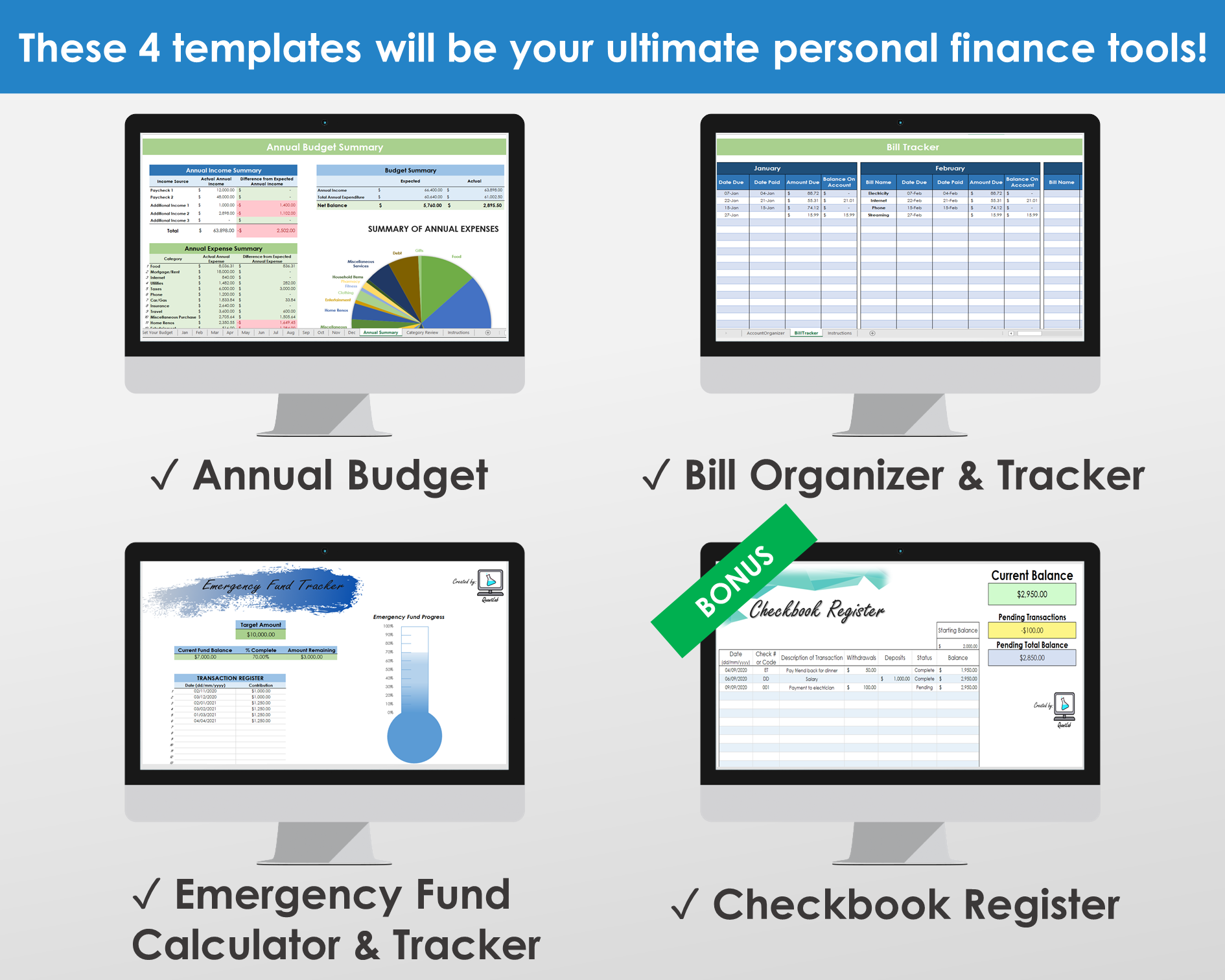 This is your ultimate bundle of personal finance tools that will let you take control of your finances! This bundle includes three personal finance spreadsheets + you will receive a *bonus* checkbook register spreadsheet free of charge, for a total of four different tools. Here is what's included: