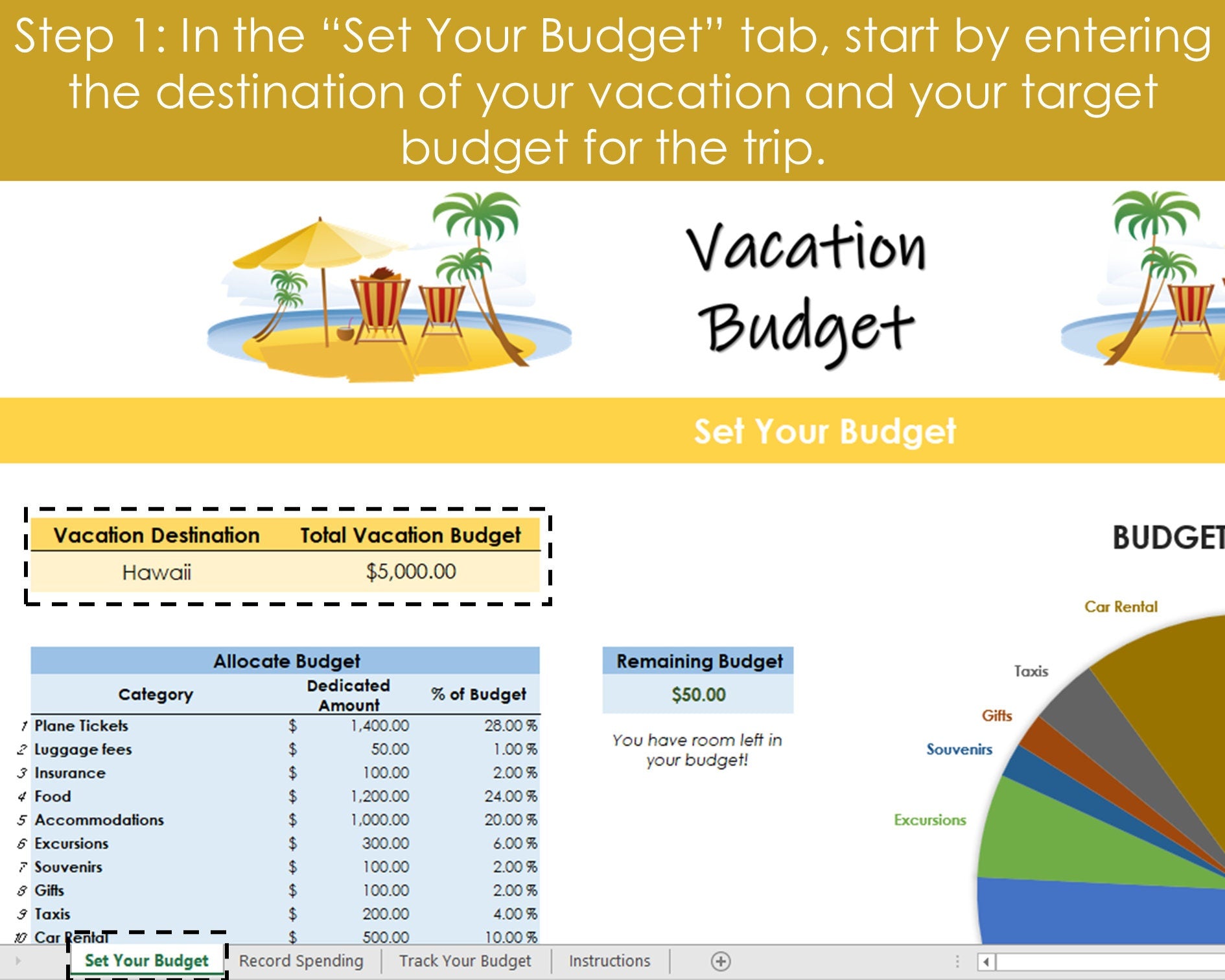 Are you excited about your next vacation but nervous about costs adding up? Well it's time to stop worrying and start budgeting! You'll be surprised how effective creating a budget can be for spending smart and getting the most value out of your money. This spreadsheet will make it easy to design a budget for your vacation and keep on top of all your trip-related expenditures! The various charts and graphs will give you a visual representation of how you are tracking relative to your budget to prevent you from over-spending. This budget planner is very simple to use: •