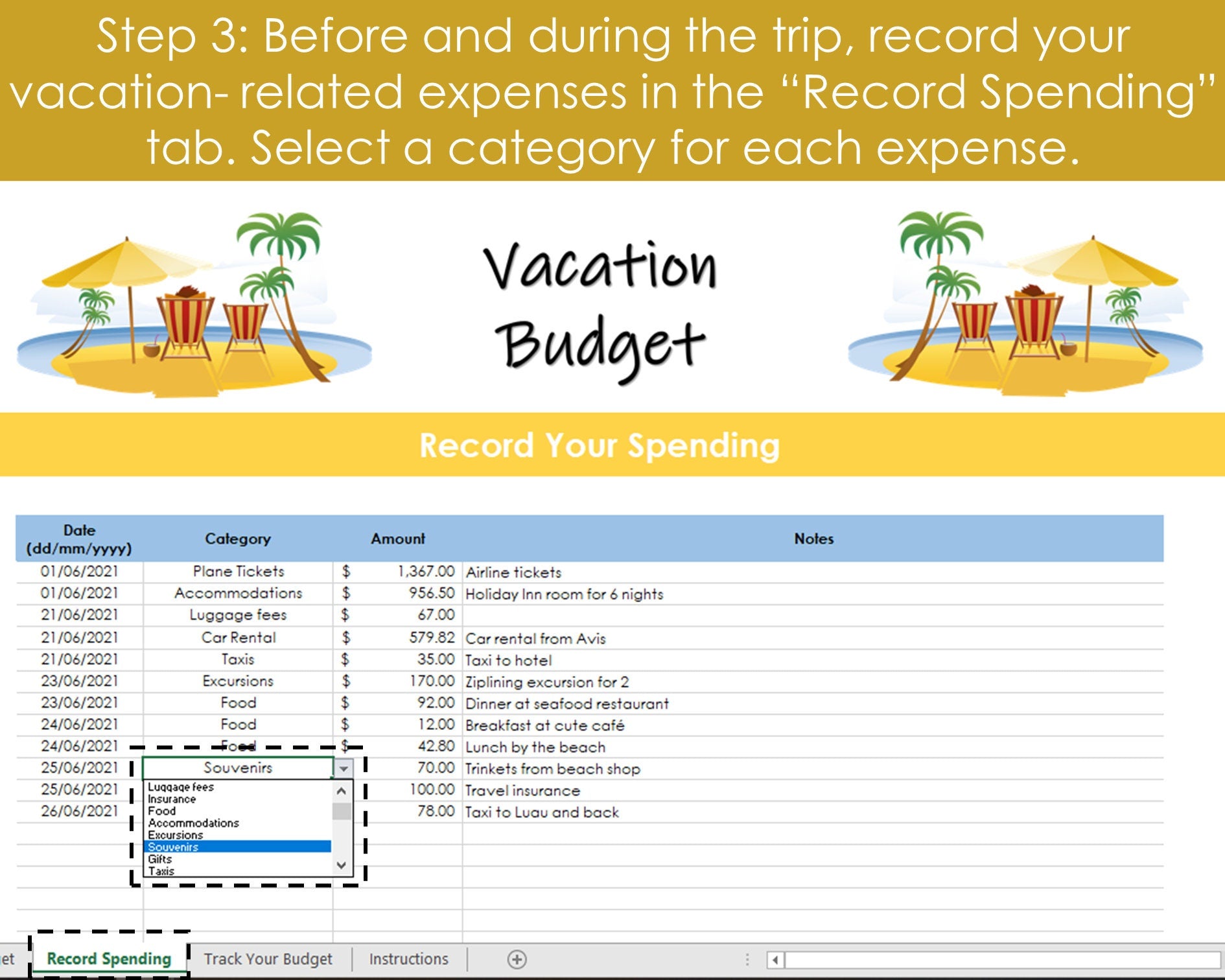 • Before and during the trip, record your daily expenses and label them under one of the spending categories
